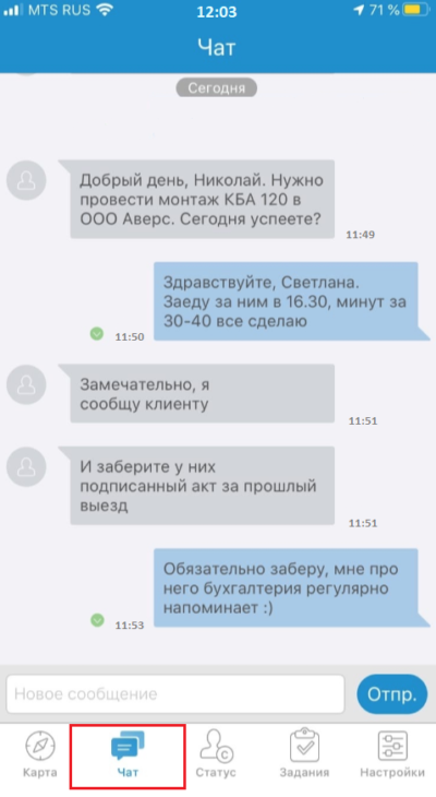 чат между выездным сотрудником и диспетчером