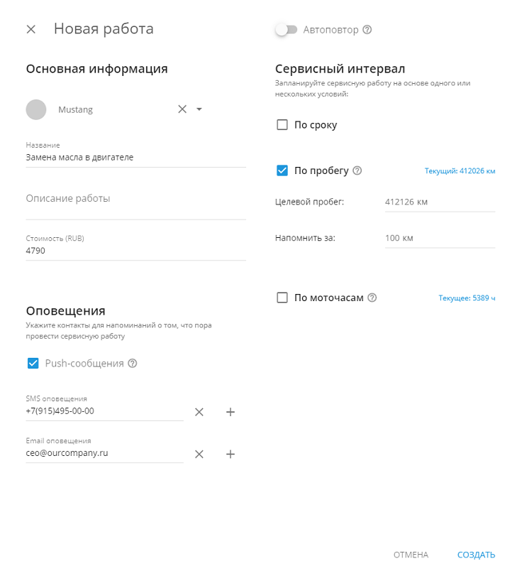 Чтобы запланировать техобслуживание автомобиля создайте сервисную работу.