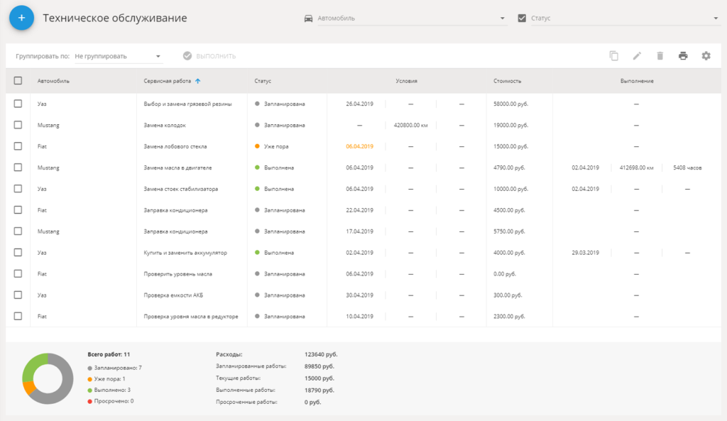 При помощи функции “Техобслуживание” вы сможете контролировать своевременное проведение регламентных и внеплановых работ в отношении корпоративного транспорта.