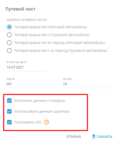 Чтобы включить в путевой лист информацию о пробеге и поездках, отметьте следующие пункты: