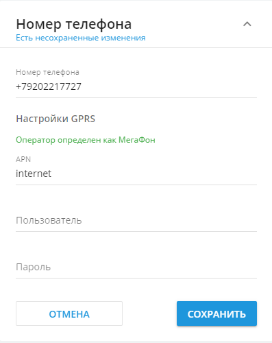 Если, после ввода номера, оператор SIM-карты определен корректно, то нажмите “Сохранить”, на указанный номер будет отправлена SMS команда с необходимыми настройками.