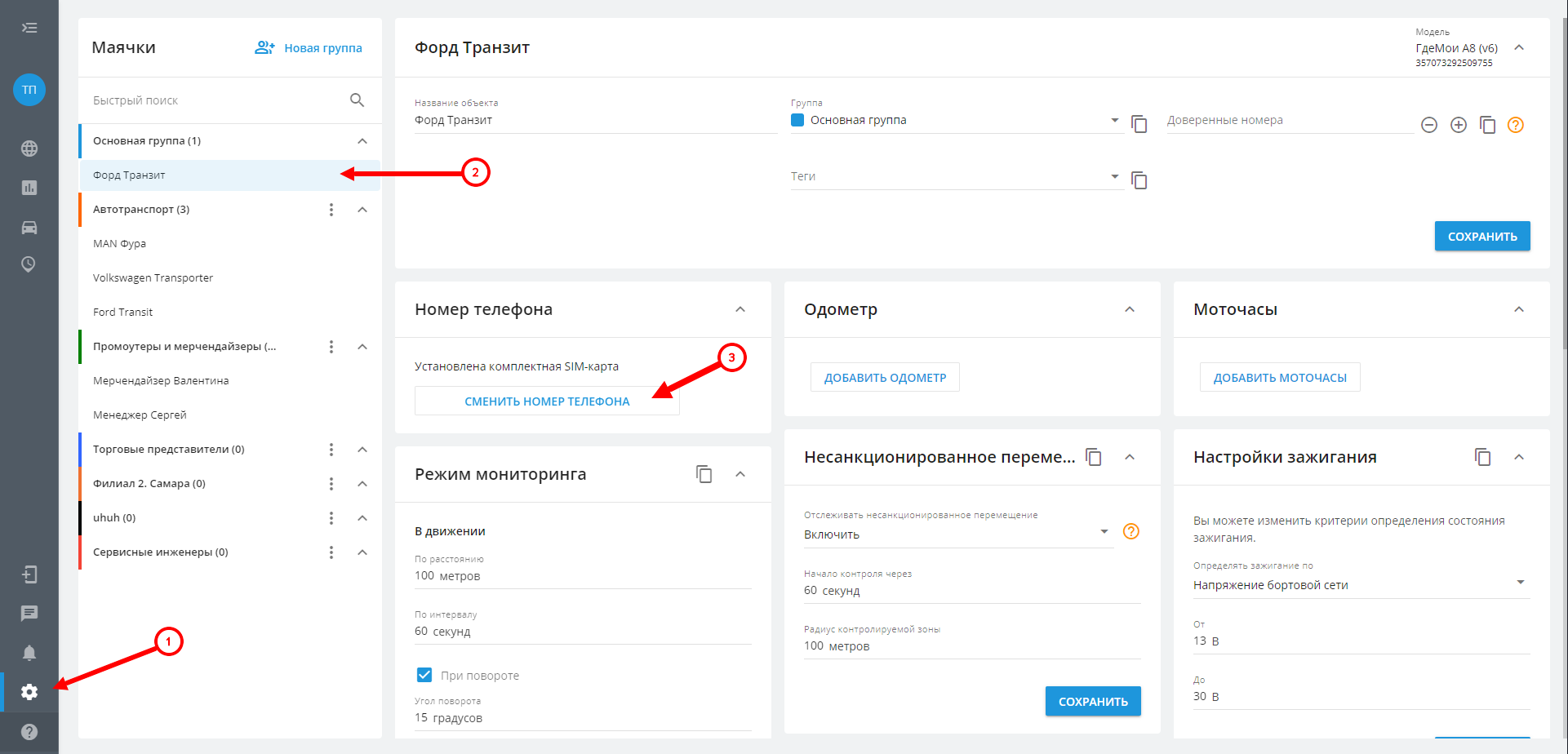 При замене SIM-карты в приборе необходимо изменить номер телефона во вкладке “Управление устройствами”. Если SIM-карту “ГдеМои” необходимо заменить на новую SIM-карту, приобретенную в нашем сервисе, вам необходимо обратиться в техническую поддержку.