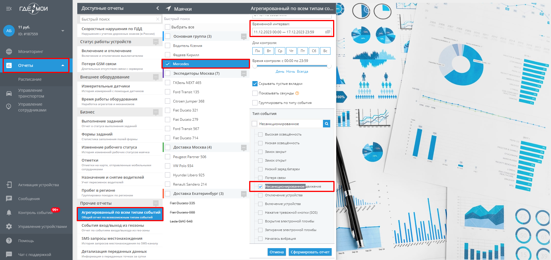 В разделе “Отчеты” нажмите “Создать отчет” и выберете раздел “Агрегированный отчёт по всем типам событий”. В списке маяков выберете нужный, укажите период и в поиске по типу события найдите и выберите “Несанкционированное движение”. Нажмите “Сформировать отчёт”.