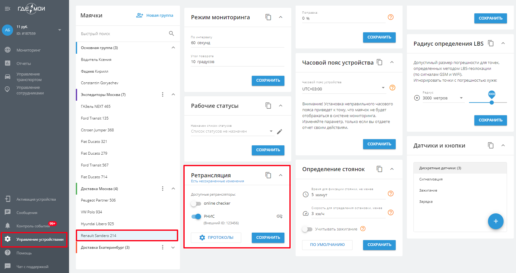 Ретрансляция данных - это пересылка данных, поступающих от трекеров с сервера “ГдеМои” на указанные пользователем сторонние серверы. Например, это могут быть серверы надзорных ведомств (“Ространснадзор” или “РНИС”) или логистические IT-системы. Такая пересылка осуществляется online - без задержки, непосредственно в момент получения данных. Они пересылаются по определенному протоколу передачи данных на указанный пользователем адрес и порт с использованием авторизации или без.