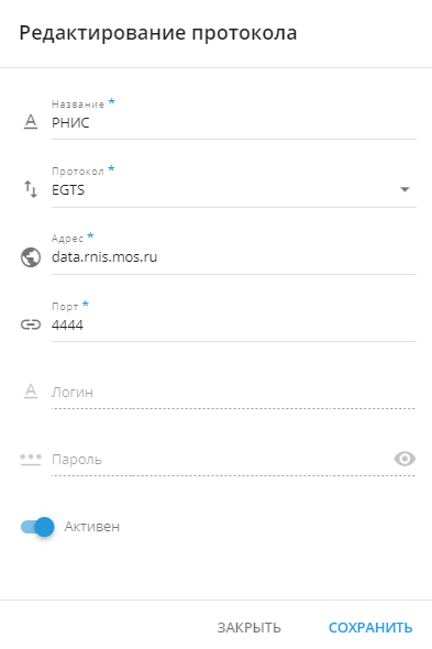 Порт сервера-получателя: 4444Убедитесь, что в протоколе ретрансляции в РНИС указан EGTS_I.