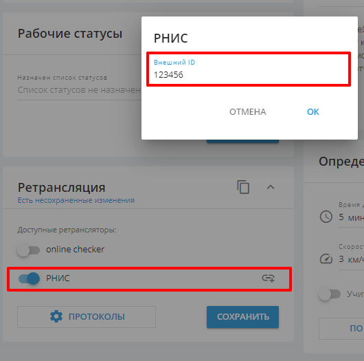 После создания протокола ретрансляции, к нему необходимо добавить объекты наблюдения посредством привязки внешнего ID (формулу генерации внешнего ID необходимо уточнить у принимающей стороны). Каждый объект можно привязать к одному или нескольким протоколам ретрансляции. Данные от этого объекта будут передаваться соответствующими ретрансляторами (если они активированы).
