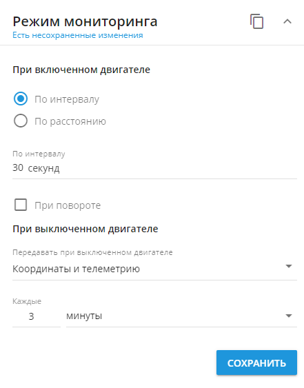 Передача данных происходит при наступлении одного из условий. Обратите внимание, что для некоторых устройств передача данных в непрерывном режиме возможна либо только по времени, либо только по расстоянию.