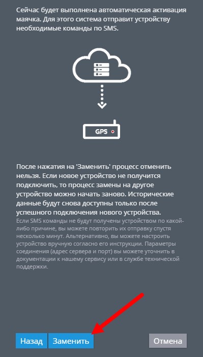 Нажмите кнопку “Заменить” и ожидайте подключения устройства к серверу