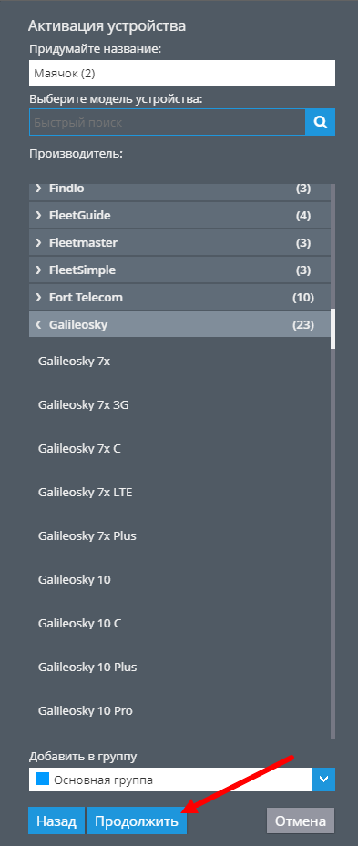 Выберите модель устройства из общего списка или воспользуйтесь строкой быстрого поиска и нажмите кнопку “Продолжить”. При необходимости выберите группу в которую будет добавлен маяк