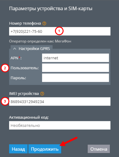 Введите номер телефона SIM-карты и IMEI устройства и нажмите “Продолжить”. Настройки GPRS устанавливаются автоматически. Если это не произошло, введите настройки вручную.